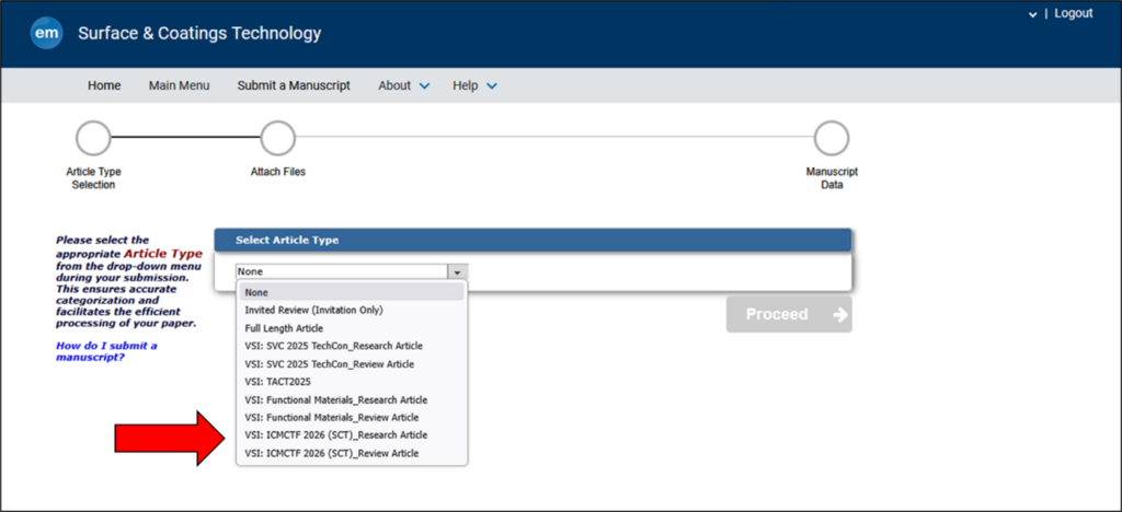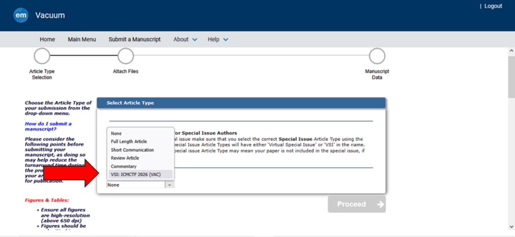 • In the new page, choose the “Article Type” of your submission from the drop-down menu on the left. You must choose “VCI: ICMCTF 2026 (VAC)” as the article type.